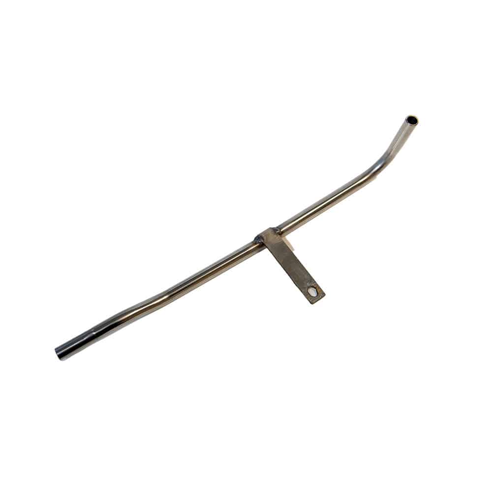 Stainless steel water pump housing pipe suitable for TR2-3A. This pipe locates in the rear of the water pump housing, secures in place on the block and allows water to be fed to the heater. It replaces the original steel pipe that corrodes.